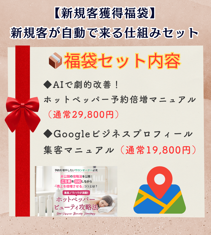 📦 セット内容 こんな方におすすめ:「ホットペッパー代が高すぎる…」「もっと効率よく新規客を集めたい」今すぐ即効性を求めたいそんな方にピッタリ!